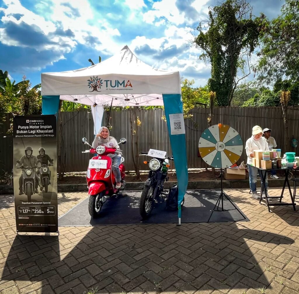 Melalui kegiatan booth activation di area PT KMK Global, PT TUMA berkolaborasi dengan CIMB Niaga Finance untuk memperkenalkan program cicilan motor tanpa uang muka (DP 0%), yang dirancang khusus untuk karyawan dengan sistem pembayaran otomatis lewat payroll.