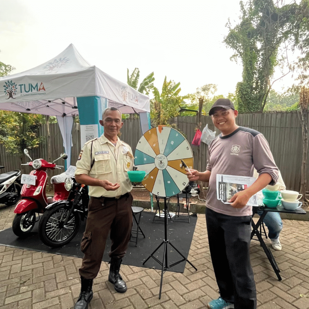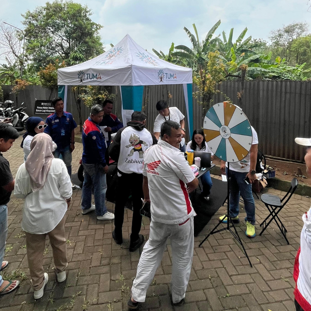 Beberapa peserta tampak tertawa saat memutar roda hadiah, sementara lainnya sibuk berdiskusi dengan tim TUMA di bawah tenda putih bertuliskan logo perusahaan.